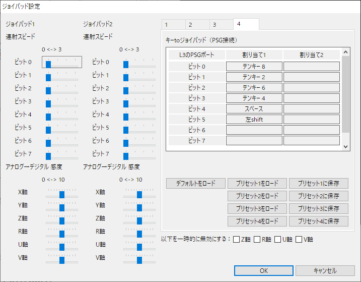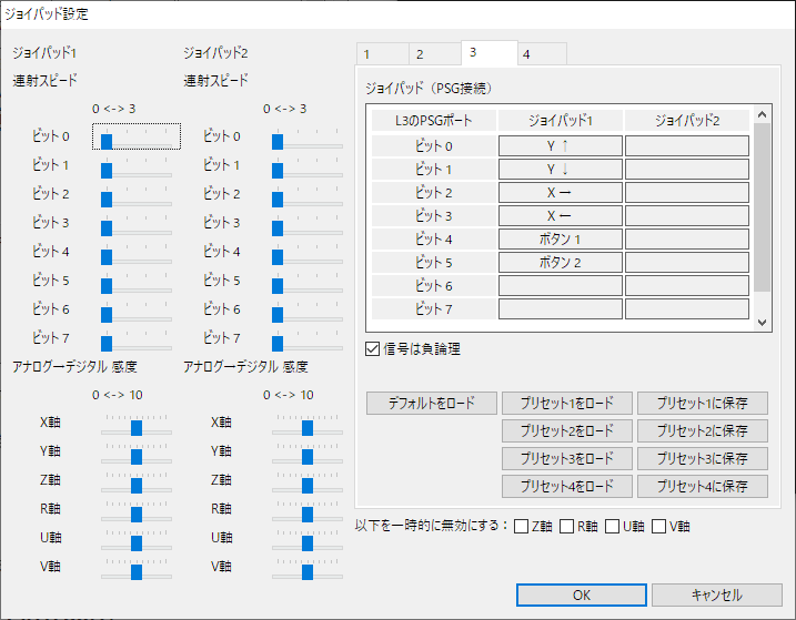 ジョイスティックによっては、アナログスティックが押しっぱなしになり割当てができない場合があります。このような場合は該当する軸のチェックを入れることでこのダイアログ内で一時的にその軸の入力を無効にすることができます。