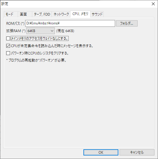 別のフォルダにROMイメージがある場合: 設定ダイアログの CPU,メモリ(CPU,Memory) -> ROMパス(ROM Path) でROMイメージのあるフォルダを指定した後、操作(Control) -> パワーオン(PowerOn) をおこなうか、このソフトを再起動してください。