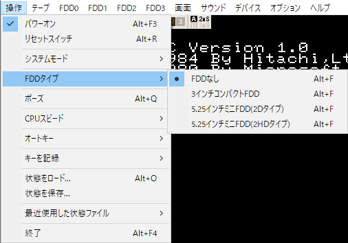 FDDを使用する状態では、前回動作時にFDD0にて最後に使用したディスクイメージを起動ディスクとします。(設定ダイアログで変更可能。)