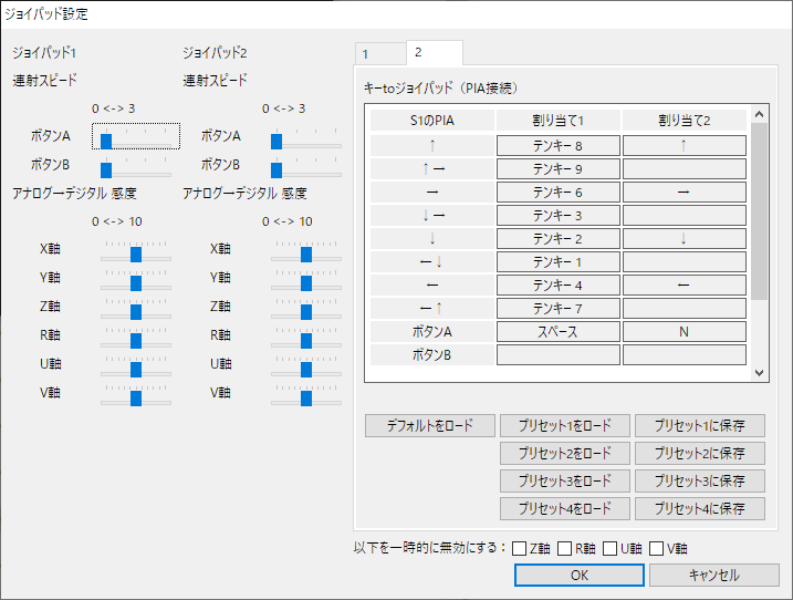 ジョイスティックによっては、アナログスティックが押しっぱなしになり割当てができない場合があります。このような場合は該当する軸のチェックを入れることでこのダイアログ内で一時的にその軸の入力を無効にすることができます。