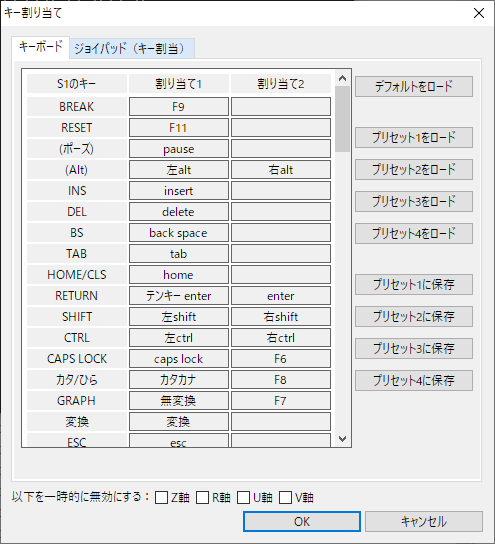 ジョイスティックによっては、アナログスティックが押しっぱなしになり割当てができない場合があります。このような場合は該当する軸のチェックを入れることでこのダイアログ内で一時的にその軸の入力を無効にすることができます。